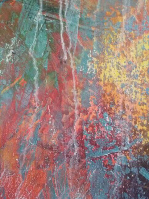 This was the 1st painting ever completed in my new studio at my house. Having the new freedom of making a big mess, I was able to use water freely to disperse the pigments. So I could color-wash the canvas and also spray watercolor washes over the wet paint. These are some of the ways I free to use different methods with paint and canvas and get a new look and express a more subtle and nuanced feeling.