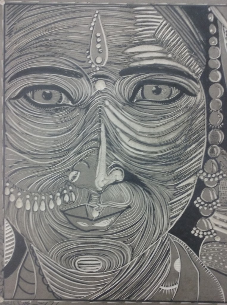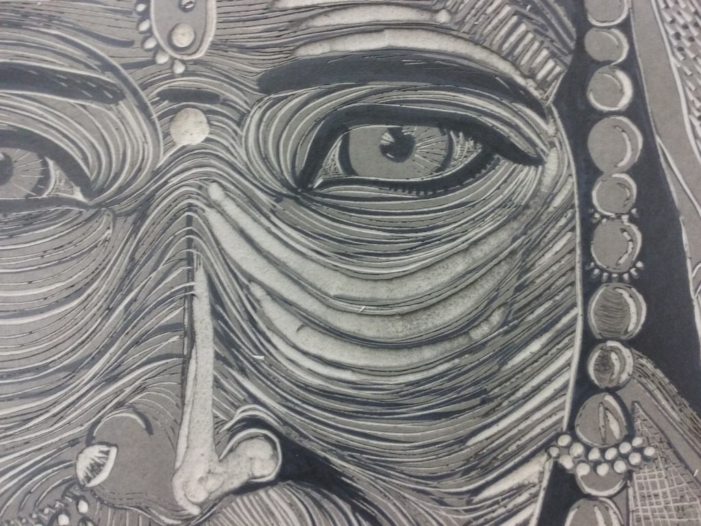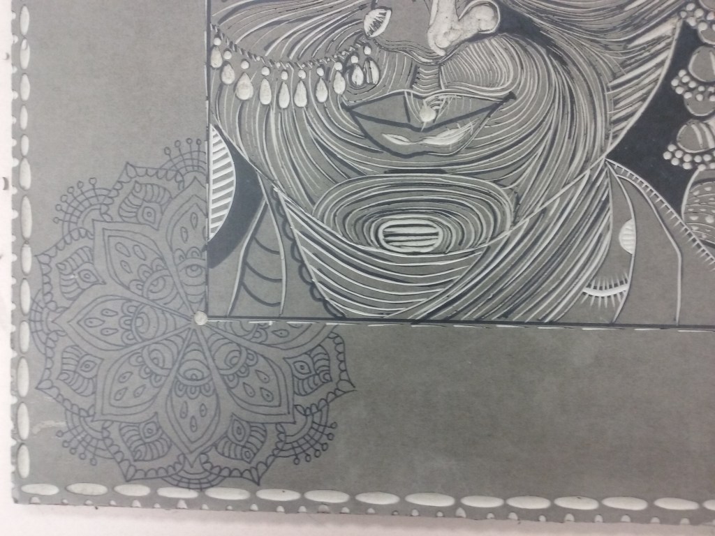 After sketching on the linoleum and doing the carving, then you make your test prints in black. When you are happy with the black print, you move forward to add colors.