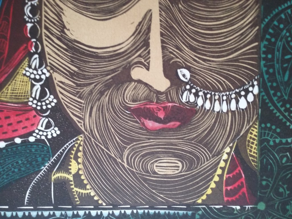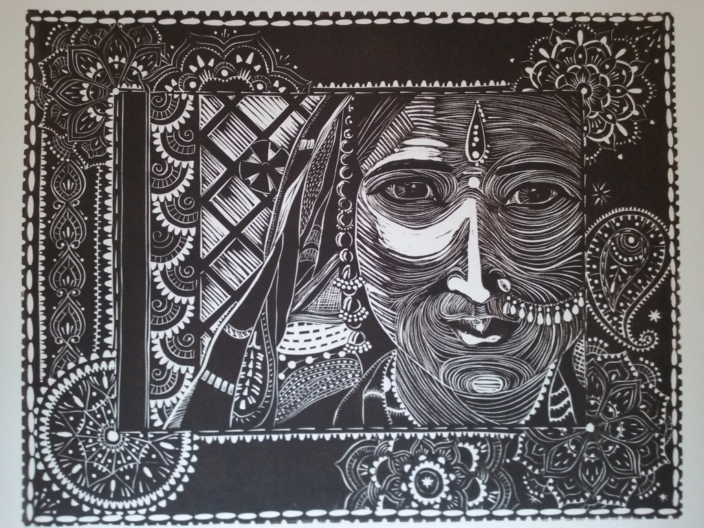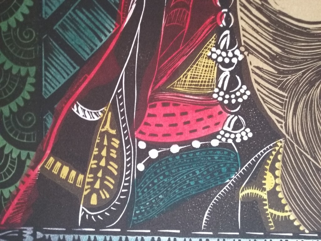 Below is the final color outcome of the print. Since completing the project , somehow the actual linocut has gotten lost. So prints cannot be made from it again.